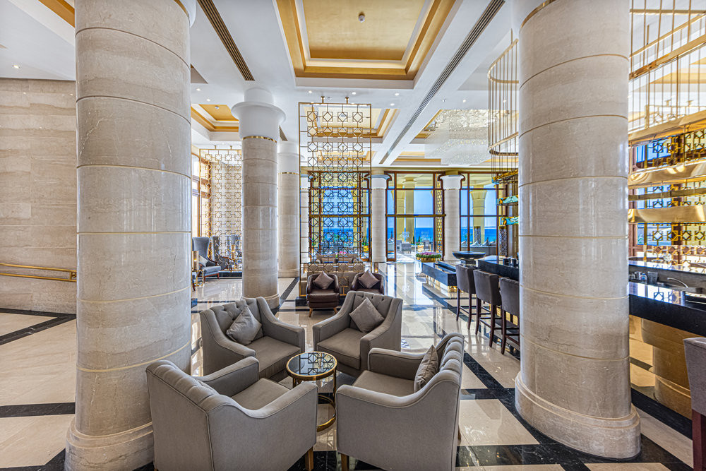 One Bedroom Serviced Apartment: балкон с видом на море, спальня с одной большой двуспальной или двумя односпальными кроватями, просторная гостиная с диваном и креслами, оборудованная кухня с обеденным столом, комната для персонала,