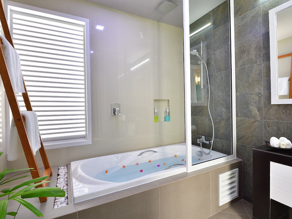 Jaccuzzi Beach Villas (65 кв. м.). Просторные пляжные виллы с джакузи. Состоят из спальни, ванной комнаты и террасы, оборудованной лежаками. Максимальное размещение — 3 взрослых. Внимание! размещение гостей в возрасте только от 18 лет,