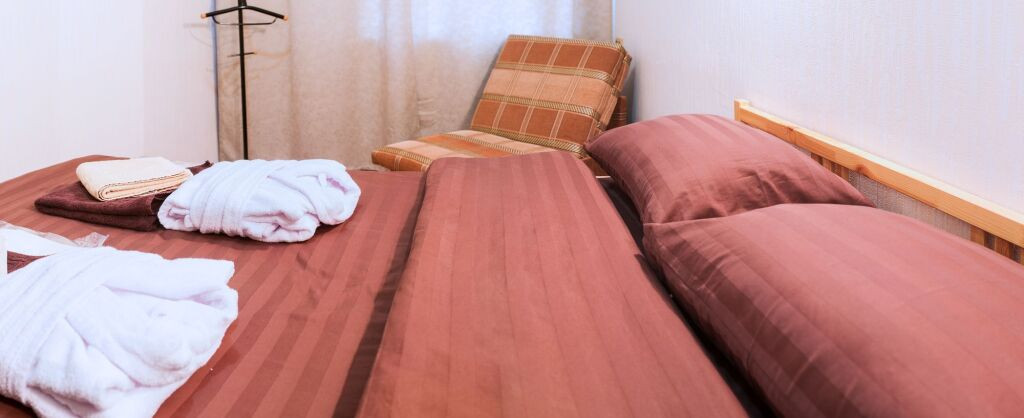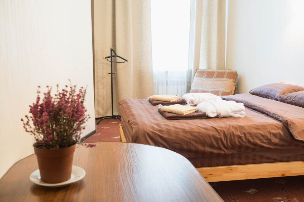 СМАРТ 2+1 (номер без удобств) — Площадь номера: от 10 кв. м. Вид из номера: во двор. Количество комнат: 1. Тип кроватей (основные места): двухъярусная. Комментарии: в номере - двухъярусная кровать (снизу - двуспальная, сверху - односпальная), шкаф, табурет, зеркало, прикроватные светильники. Удобства (душ, туалет) находятся на этаже,