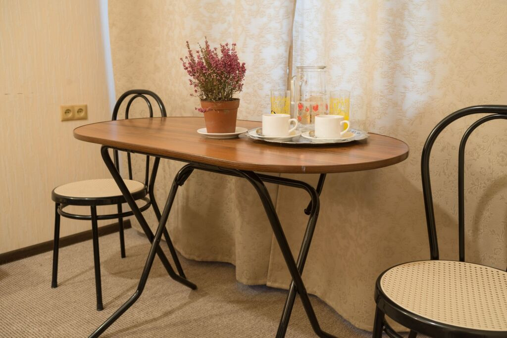 СТУДИЯ С КУХНЕЙ (номер с удобствами) — Площадь номера: от 14 кв. м. Вид из номера: во двор. Количество комнат: 1. Тип кроватей (основные места): двуспальная. Комментарии: в номере - двуспальная кровать на подиуме, полки и плечики для одежды, зеркало, стол, два стула, телевизор, а также небольшая кухня, укомплектованная микроволновой печью, чайником, плитой, холодильником и комплектом необходимой посуды. Удобства (душ, туалет, раковина, фен) - в номере,