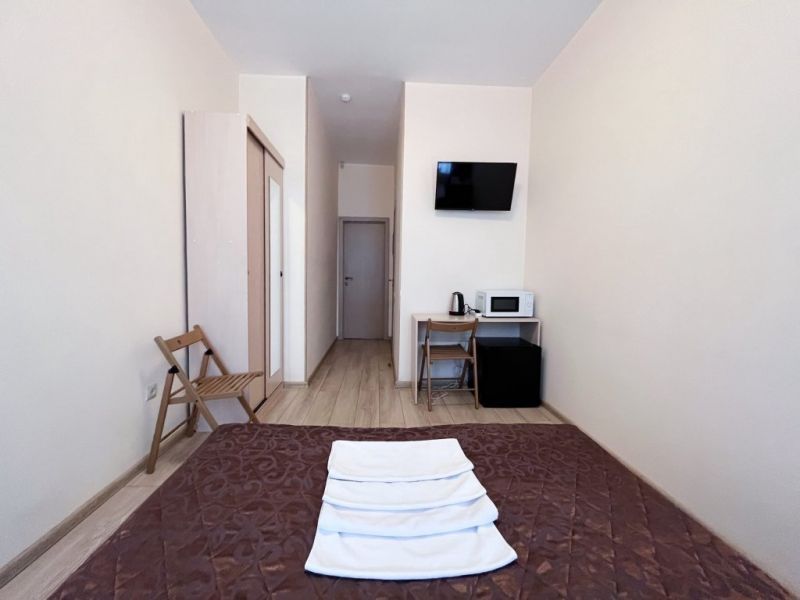СТУДИЯ С КУХНЕЙ 2+Д (номер с удобствами) — Площадь номера: от 14 кв. м. Вид из номера: во двор. Количество комнат: 1. Тип кроватей (основные места): двуспальная, одноместный диван. Комментарии: в номере - двуспальная кровать на подиуме, полки и плечики для одежды, зеркало, стол, два стула, телевизор, а также небольшая кухня, укомплектованная микроволновой печью, чайником, плитой, холодильником и комплектом необходимой посуды. Удобства (душ, туалет, раковина, фен) - в номере,