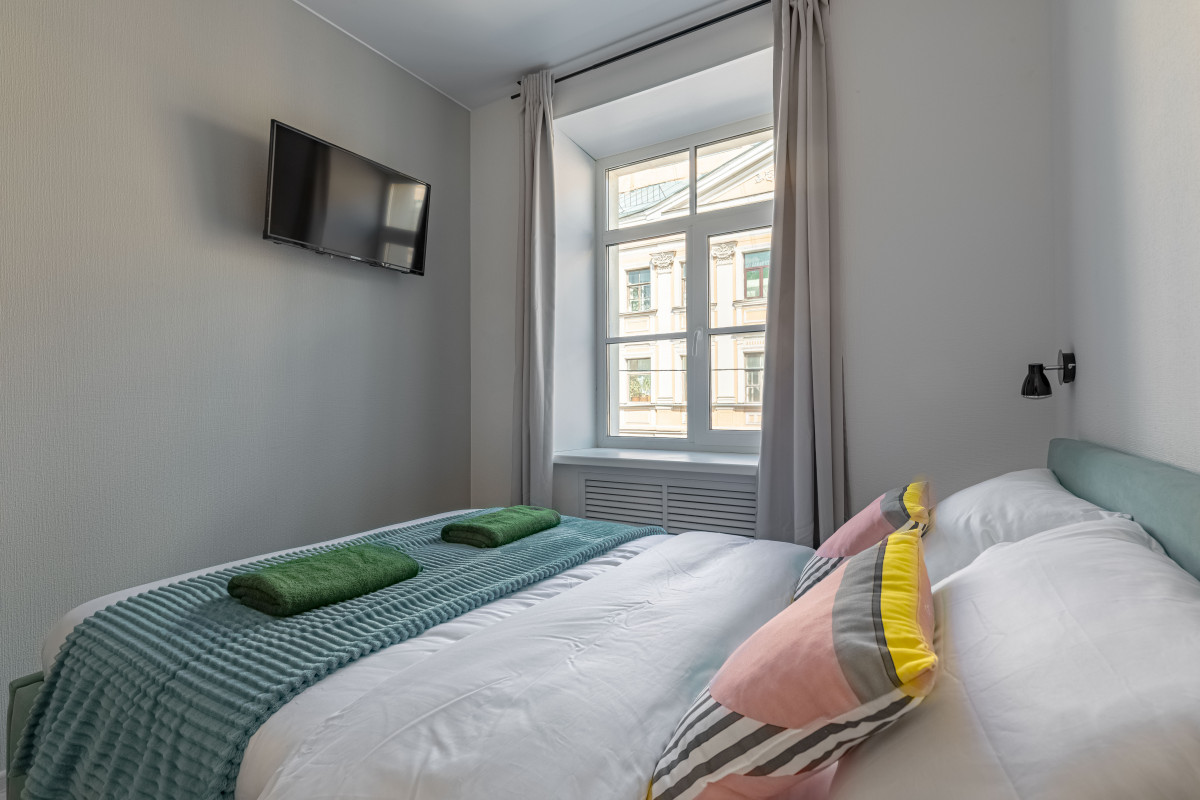 Стандарт с 2-спальной кроватью — 13 кв. м. Номер оснащен двуспальной кроватью, индивидуальной ванной комнатой с санузлом, собственной мини-кухней, стиральной машиной и гладильными принадлежностями в общей зоне отеля,
