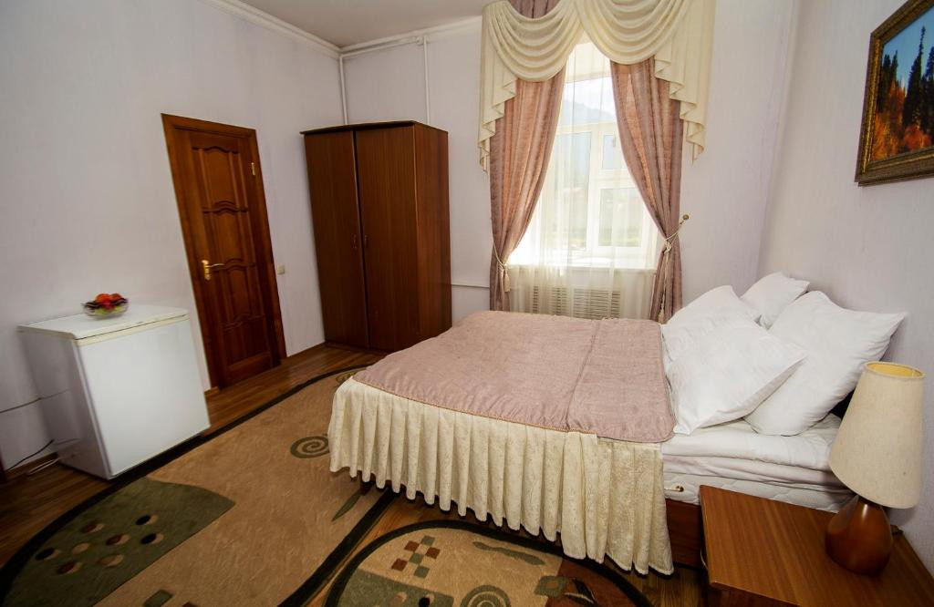 Двухместный — 14 кв. м, двухместный номер в малом корпусе с видом во двор, двуспальной кроватью, шкафом, журнальным столиком, стульями, санузлом с ванной, макс. 2 чел.,